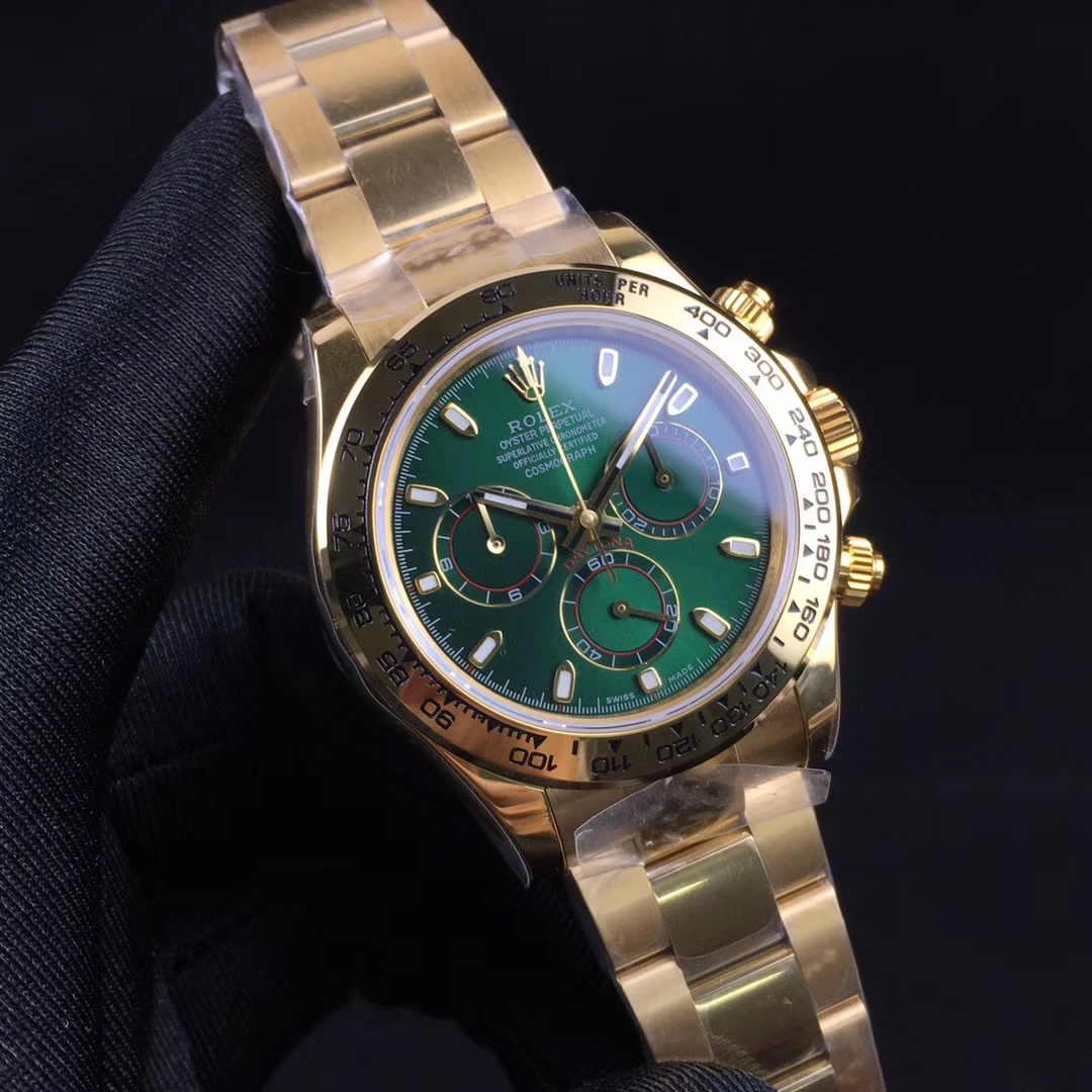 ダイアルはミラーダイアル仕上げインダイアルは溝あり抜群です使用ハンドはインダイアル&クロノ針共に116523専用です装着ブレスはデイトナ専用ショートクラスプタイプ/マイナスネジ/センターピース鏡面FFは一体最新現行タイプを採用しておりますサファイアクリスタル肉眼で判断にくいNEW王冠小極薄透かし(レーザーエッチング) クロノ完全稼動モデルですインダイアルは3時位置30分積算計、6時位置(スモセコ)永久秒針、9時位置12時間積算計でオリジナルと同様の動きで御座います。