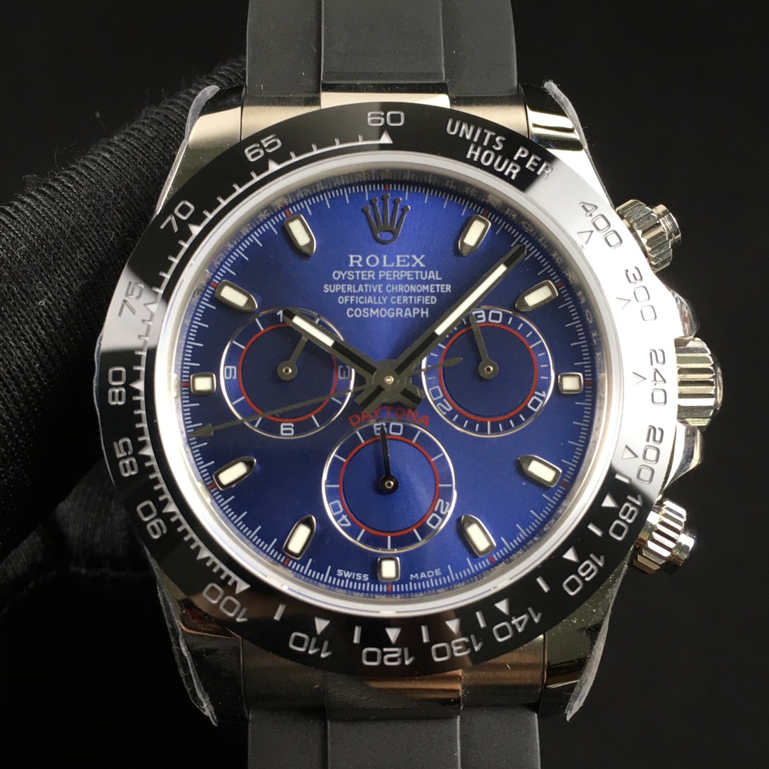ダイアルはミラーダイアル仕上げインダイアルは溝あり抜群です使用ハンドはインダイアル&クロノ針共に116523専用です装着ブレスはデイトナ専用ショートクラスプタイプ/マイナスネジ/センターピース鏡面FFは一体最新現行タイプを採用しておりますサファイアクリスタル肉眼で判断にくいNEW王冠小極薄透かし(レーザーエッチング) クロノ完全稼動モデルですインダイアルは3時位置30分積算計、6時位置(スモセコ)永久秒針、9時位置12時間積算計でオリジナルと同様の動きで御座います。
